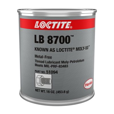 LOCTITE® LB 8700 is a gray, smooth thread lubricant paste formulated from molybdenum disulfide and petrolatum. Can be used on machine threads, tapered pipe threads, for press-fit and slip-fit joints. It is used in applications with an operating range of -29 °C to 398 °C (-20.2 °F to 748.4 °F).