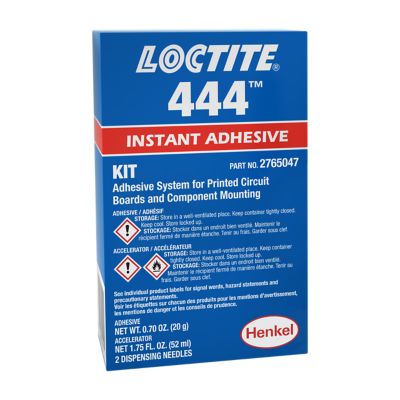 LOCTITE® 444 is a general purpose, medium-viscosity instant adhesive with a fixture time of 20-40 seconds. It is ideally suited for tacking wire to coil forms, tamper-proofing adjustable components and mounting standoffs, edge guides and stiffeners to circuit boards when used together with a LOCTITE® accelerator. It is also suitable for rubbers, metals and plastics.
