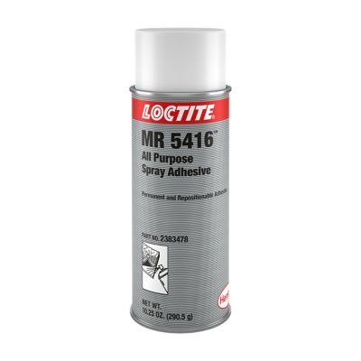 LOCTITE® MR 5416 is a milky white, viscous, general purpose, pressure-sensitive, solvent-based spray adhesive that allows both permanent and repositionable bonding. Typical applications include paper, fabric, leather, cardboard, polystyrene foam, foam rubber, foil, metal, most plastics, rubber, felt, cork, glass and wood.