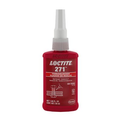 LOCTITE® 271 is a red, low viscosity, high strength, anaerobic-curing threadlocking adhesive for the prevention of fastener loosening due to heavy shock and vibration. It fluoresces under UV light – great for quality control.