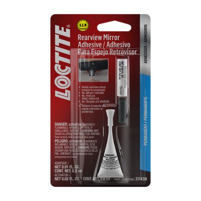 LOCTITE® Rear View Mirror Kit is an adhesive for permanently remounting broken rearview mirrors back to the windscreen. It's particularly ideal for metal mirror feet, where it achieves handling strength in seconds and mirror-mounting strength in 15 minutes. LOCTITE Rear View Mirror Kit is OEM-approved for use by GM, Ford, and Daimler-Chrysler and is available in single- and multi-application size packaging.