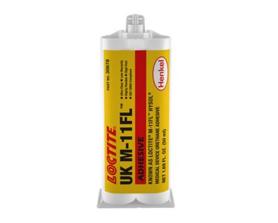 LOCTITE® UK M-11FL is a clear, water-white, 2-part, low viscosity, polyisocyanate urethane adhesive liquid that forms a non-yellowing, highly flexible bondline with excellent peel strength. It can be used on materials that include polycarbonate and many other plastics, as well as glass and metal. It is suitable for the assembly of disposable medical devices, having Henkel's ISO 10993 Protocol.