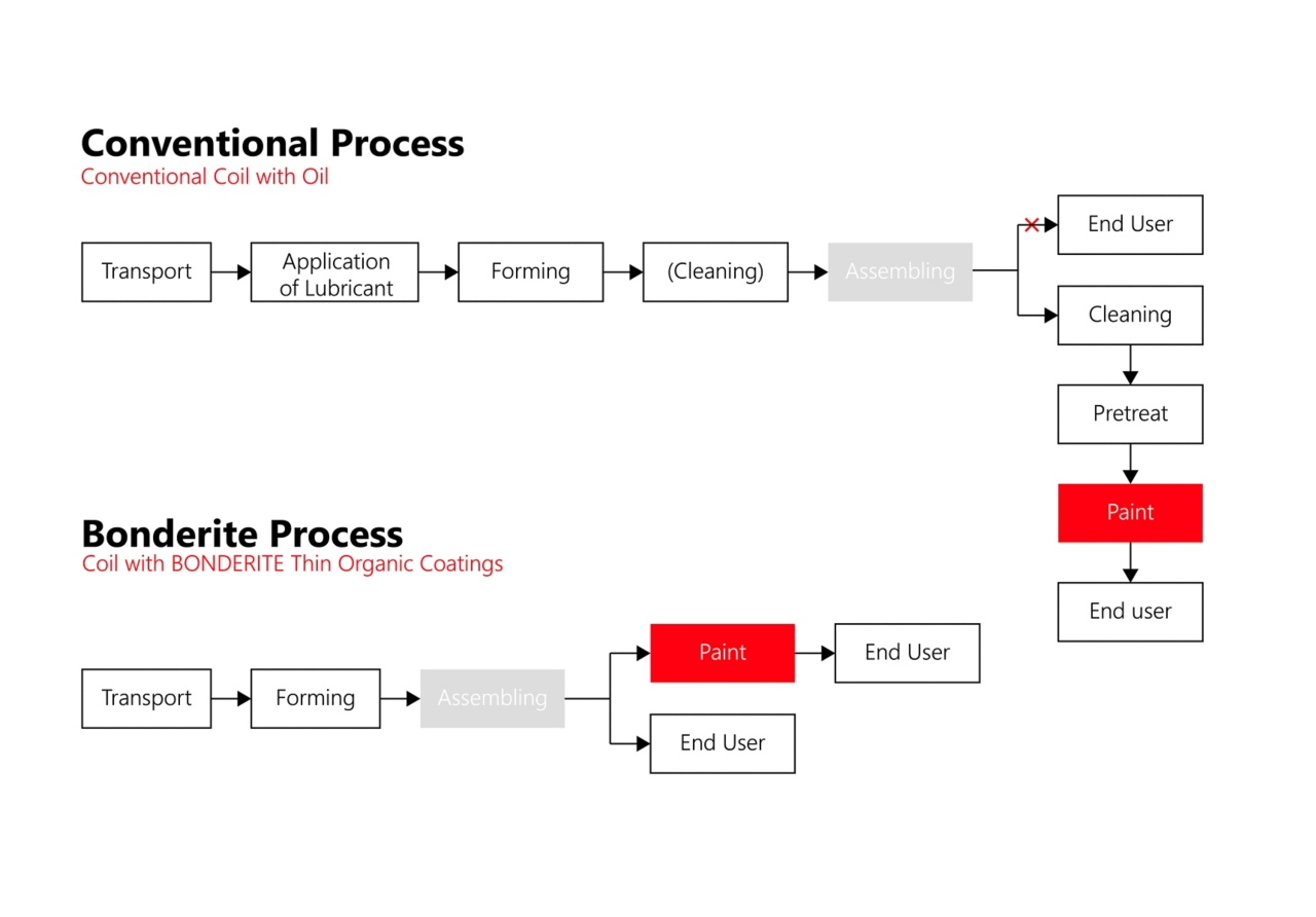 Coil coating is one of the key applications for hot-dipped galvanizing cold-rolled steel and zinc. Good cleaning and pretreatment are essential for this process. Before the pretreatment step, the material is cleaned and the surface is activated. New BONDERITE® cleaners are available to improve adhesion, and they work in synergy with the pretreatment to avoid blistering of the paint.