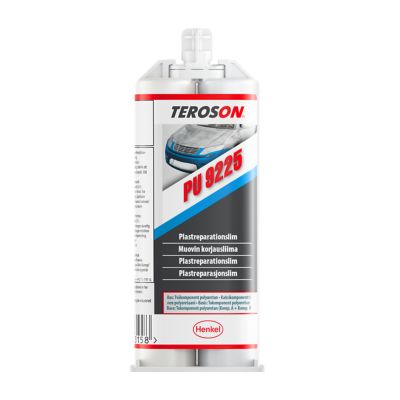 TEROSON® PU 9225 is a 2-part polyurethane repair adhesive. It is typically used for repair tasks on paintable interior and exterior plastic parts, in particular for damages such as scratches or holes in bumpers, spoilers, aprons, etc. The product can be cured with infrared light at 60°C (140°F) or Flexitherm heating pads. Easy application with the TEROMIX® HAND GUN (50 ml cartridges) or TEROSON® ET STAKU HAND GUN (250 ml cartridges) and appropriate static mixer. Before application, surface cleaning with TEROSON® VR 10 and priming with TEROSON® VR 155 are recommended. TEROSON PU 9225 cures at room temperature, with accelerated cure possible using infrared heat at 60°C (140°F).